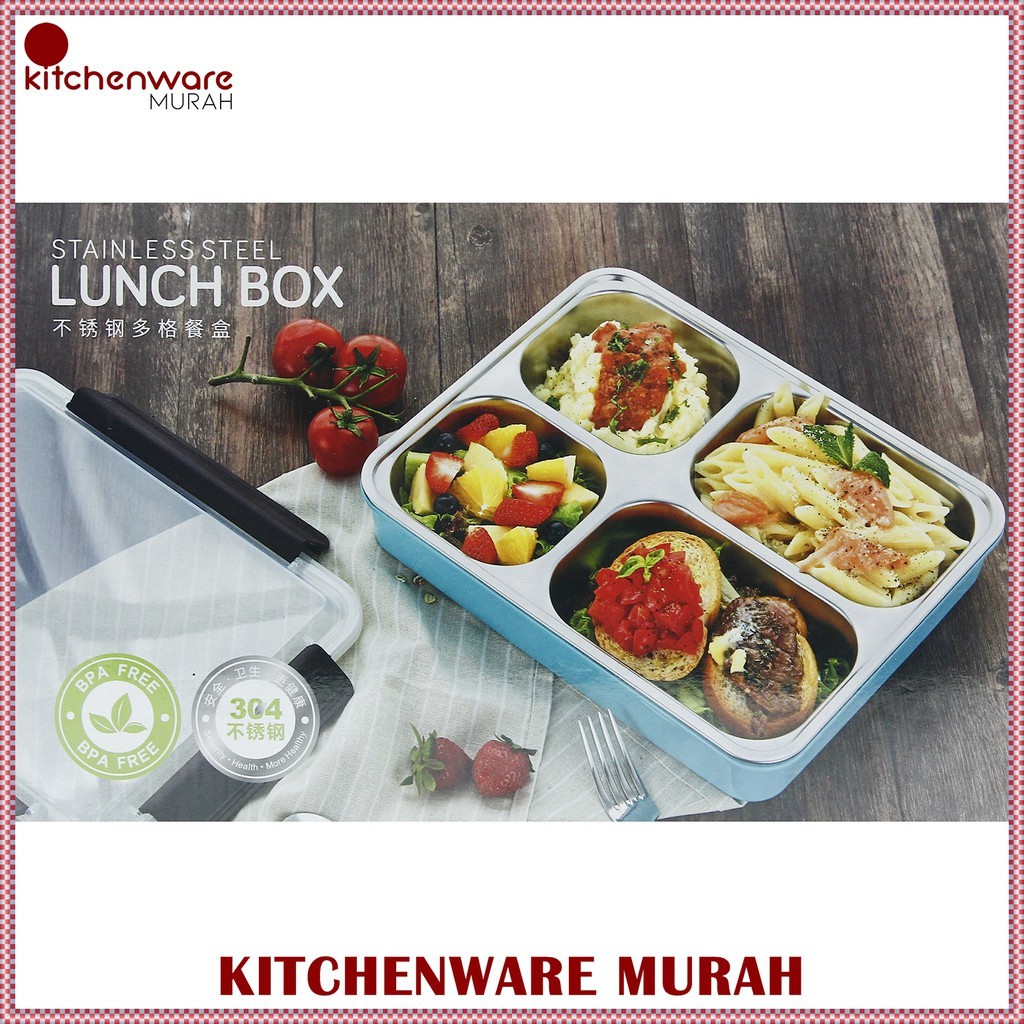 Tempat Makan Bekal Lunch Box Stainless Steel - 4SekatDeskripsi ProdukTempat makan yang bagian dalamnya terbuat dari stainless steel premium kualitas. Terdapat 3 grid untuk tempat nasi, sayur, daging atau buah. Cocok untuk dibawa ke kantor atau sekolah.Di bagian dalam tutupnya ada ring lapisan anti tumpah / bocor dan bagian luarnya ada 4 pengunci sehingga semakin aman saat dibawa ke kantor atau sekolah.Bagian luar dilapisi dengan bahan plastik sehingga tidak panas saat dipegang. Bahan plastiknya bisa dimasukkan ke dalam microwave.Bagian stainless steelnya bisa dilepas sehingga mudah dibersihkan.Ukuran : 26 cm x 19.5 cm x 5 cmDeskripsi ProdukTempat makan yang bagian dalamnya terbuat dari stainless steel premium kualitas. Terdapat 4 grid untuk tempat nasi, sayur, daging atau buah. Cocok untuk dibawa ke kantor atau sekolah.Di bagian dalam tutupnya ada ring lapisan anti tumpah / bocor dan bagian luarnya ada 4 pengunci sehingga semakin aman saat dibawa ke kantor atau sekolah.Bagian luar dilapisi dengan bahan plastik sehingga tidak panas saat dipegang. Bahan plastiknya bisa dimasukkan ke dalam microwave.Bagian stainless steelnya bisa dilepas sehingga mudah dibersihkan.Ukuran : 26 cm x 19.5 cm x