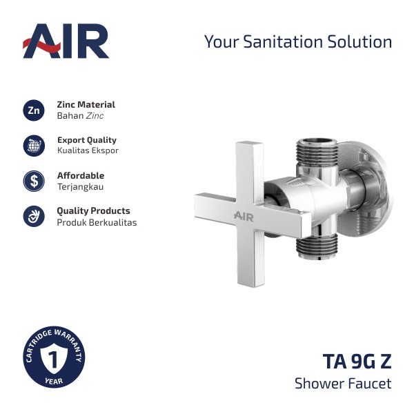 Deskripsi AIR Kran Shower Cabang Keran Air / Angle Faucet TA 9G Z[READY STOK]Estimasi pengiriman: Jabodetabek 4-7 hari kerja, luar Jabodetabek 5-14 hari kerja. Order masuk > jam 11.00 ikut pengiriman besok (termasuk JNE YES).- Kran cabang air dingin untuk instalasi pipa 1 / 2 inch- Aplikasi umum untuk closet shower / bidet dengan, instalasi kloset- 1(satu) Handle bentuk Baling untuk on/off kedua lubang (tidak bisa bergantian)- Ekonomis serta mudah dalam pemasangan- Panjang x lebar x tinggi : 9 cm x 6.5 cm x 6.5 cm- Cara pakai nya adalah dgn memutar posisi stang dari posisi semula ke arah berlawanan jarum jam 90 derajat dari off